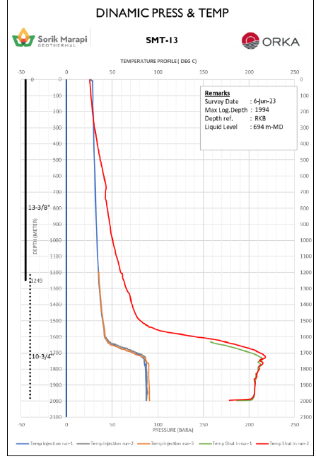 2023年6月7日,SMGP鉆井和資源團隊對耗時27天、于6月6日完井的T-13井進行了完井測試。測試數據顯示:T-13是一口高溫、高流動性的生產井,成功打出了因T-11修井失敗而損失的熱源。該井吸水指數在54.76kg/s/bar到94.12kg/s/bar之間,在停止注水后4.5小時后井下最高溫度即錄得217.9℃。其生產層穩定在300℃的情況下,該井預計可生產190噸/小時的高壓蒸汽。