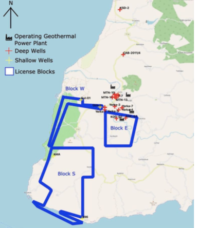 圖1:TTG的地?zé)衢_發(fā)準(zhǔn)證,其中藍(lán)色邊界線內(nèi)為準(zhǔn)證覆蓋區(qū)域(E區(qū)塊Transmark GPP項(xiàng)目所在地)。